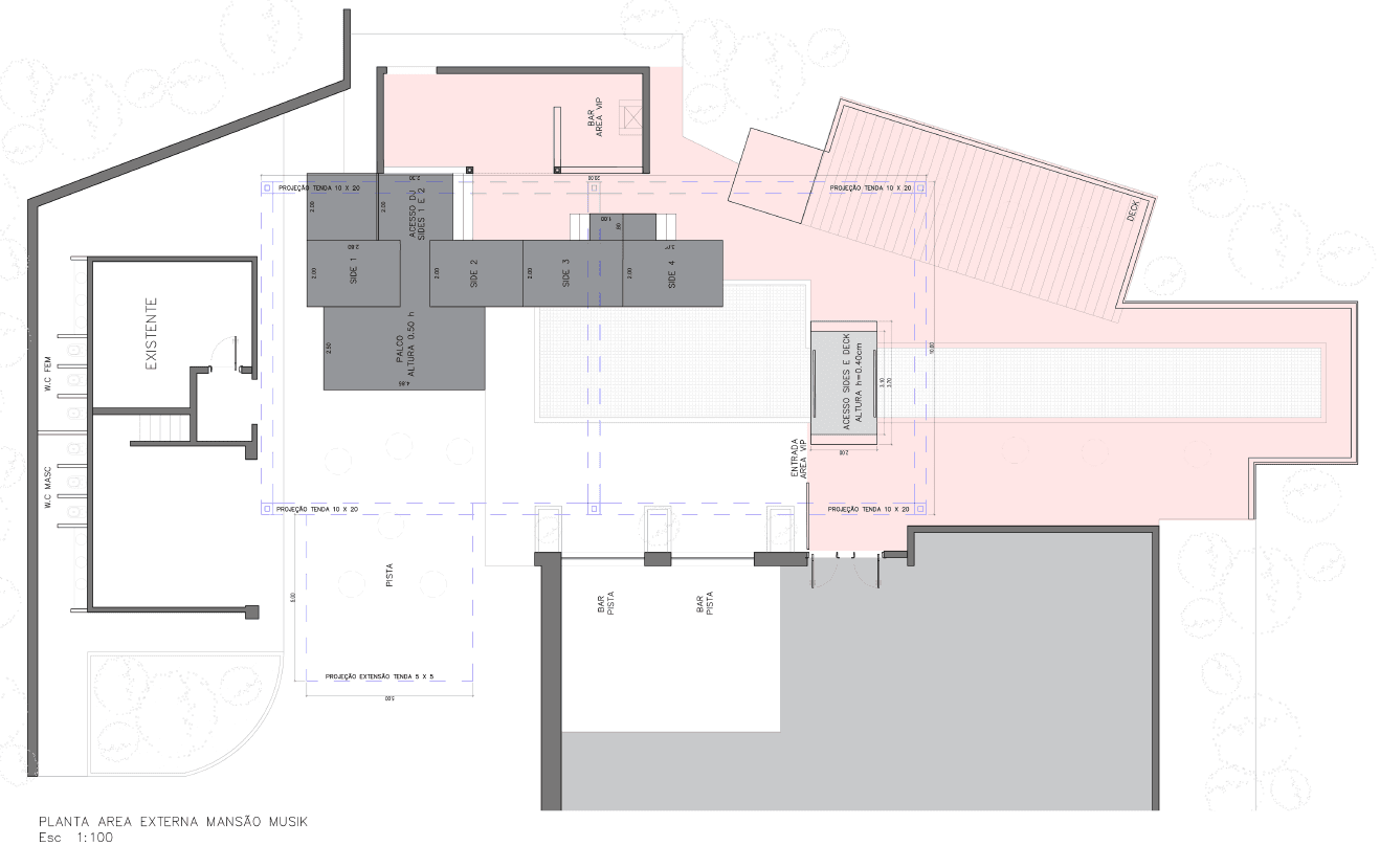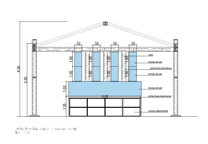 Neste projeto, Leandro criou toda a estrutura necessária para a realização das festas no local, com enfoque no palco principal, composto por estruturas metálicas.