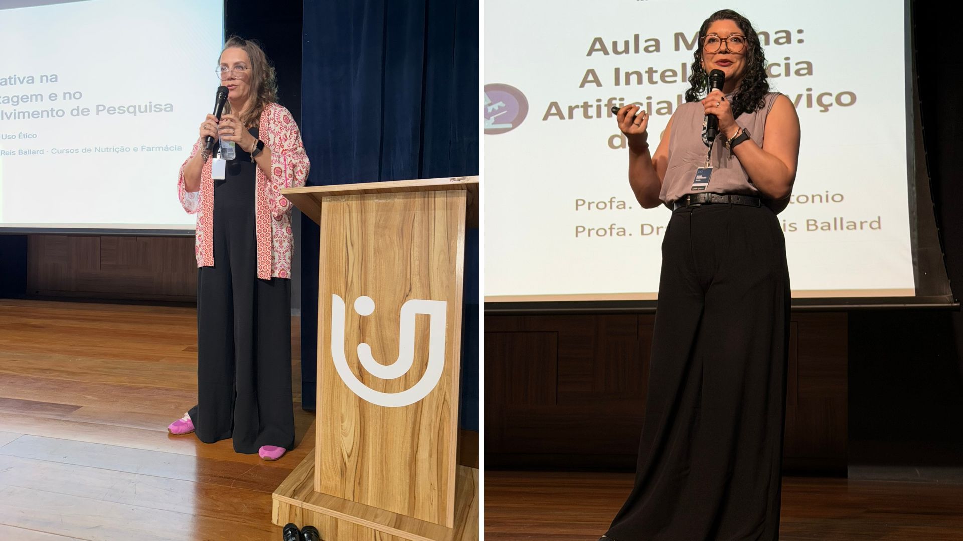 A palestra foi conduzida pelas professoras doutoras Aline Teotonio Rodrigues, do curso de Farmácia da UniMAX, e Cíntia Reis Ballard, do curso de Nutrição da UniMAX, que abordaram o uso da IA sob a perspectiva do método científico, da ética e do desenvolvimento do pensamento crítico.