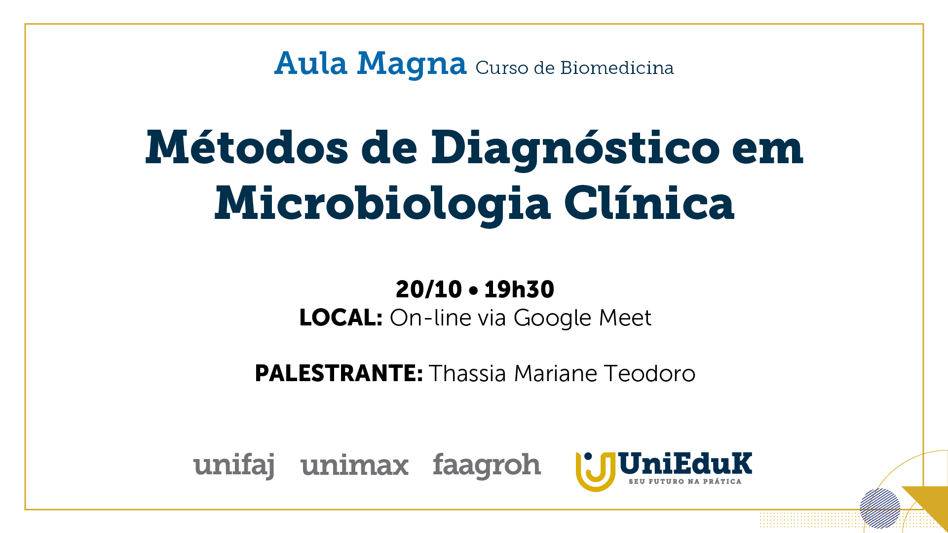 O curso de Biomedicina do Grupo UniEduK organiza Aula Magna com o tema “Métodos de Diagnóstico em Microbiologia Clínica”. A atividade acontece no dia 20/10 (quarta-feira) de forma remota, pelo Google Meet, com início às 19h30.