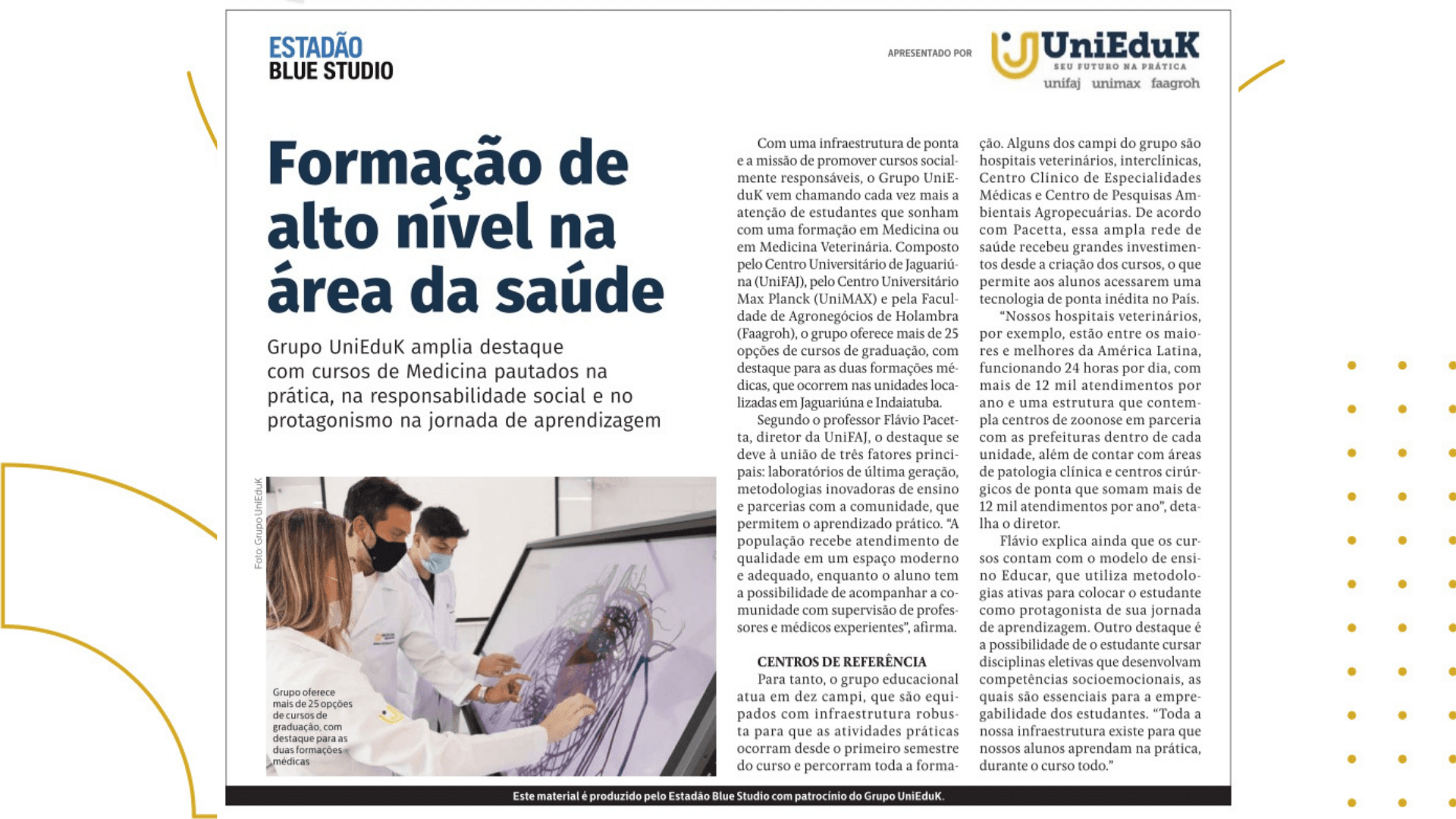 Os portais Estadão Educação, Terra Notícias e MSN Notícias publicaram um texto ressaltando a qualidade e excelência do Grupo UniEduK na formação de profissionais da área da saúde com destaque para os cursos de Medicina e Medicina Veterinária.